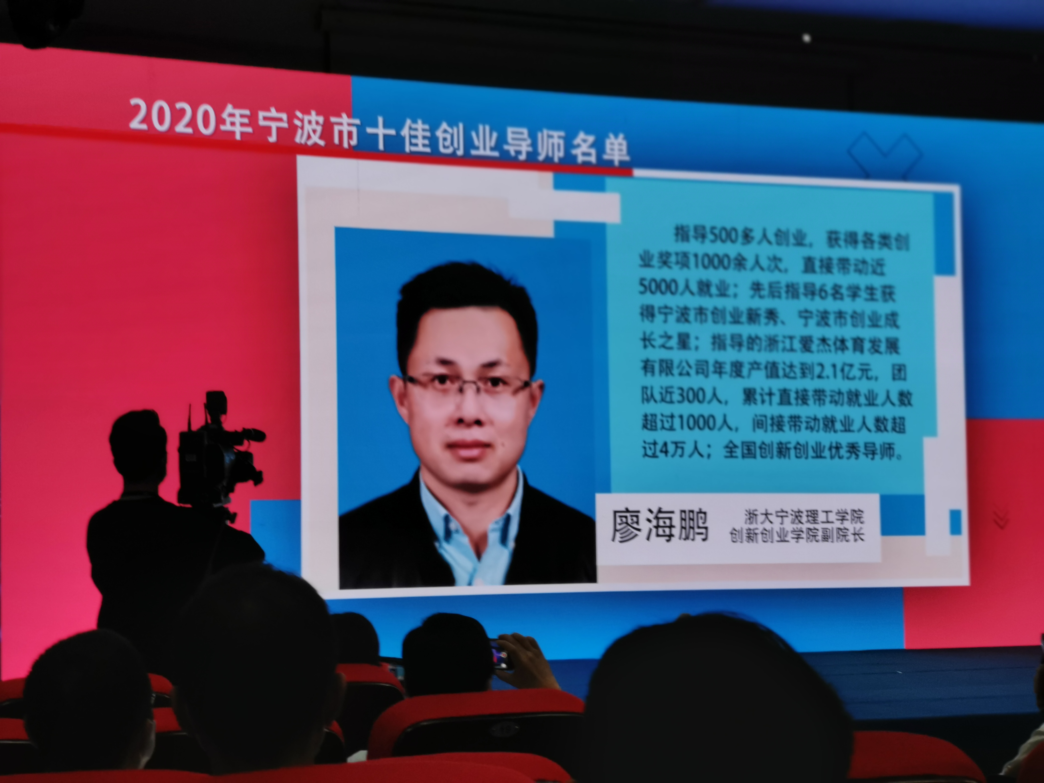 廖海鹏老师自从事创新创业管理工作以来,先后指导我校500多名学生创业,获得各类创业奖项1000余人次,直接带动近5000人就业;先后指导的6名优秀创业学生获得“宁波市创业新秀”、“宁波市创业成长之星”等荣誉称号;指导的优秀创业企业——浙江爱杰体育发展有限公司年度产值达到2.1亿元,团队近300人,累计直接带动就业人数超过1000人,间接带动就业人数超过4万人。廖海鹏老师现为国家首批创新创业导师、全球职业规划师(GCDF)、创业咨询师、创业指导师、KAB创业指导师和KAB讲师以及职业指导师,宁波市创业指导专家志愿团成员、宁波市模拟公司创业实训项目专家委员会委员和宁波市优秀创业指导教师。