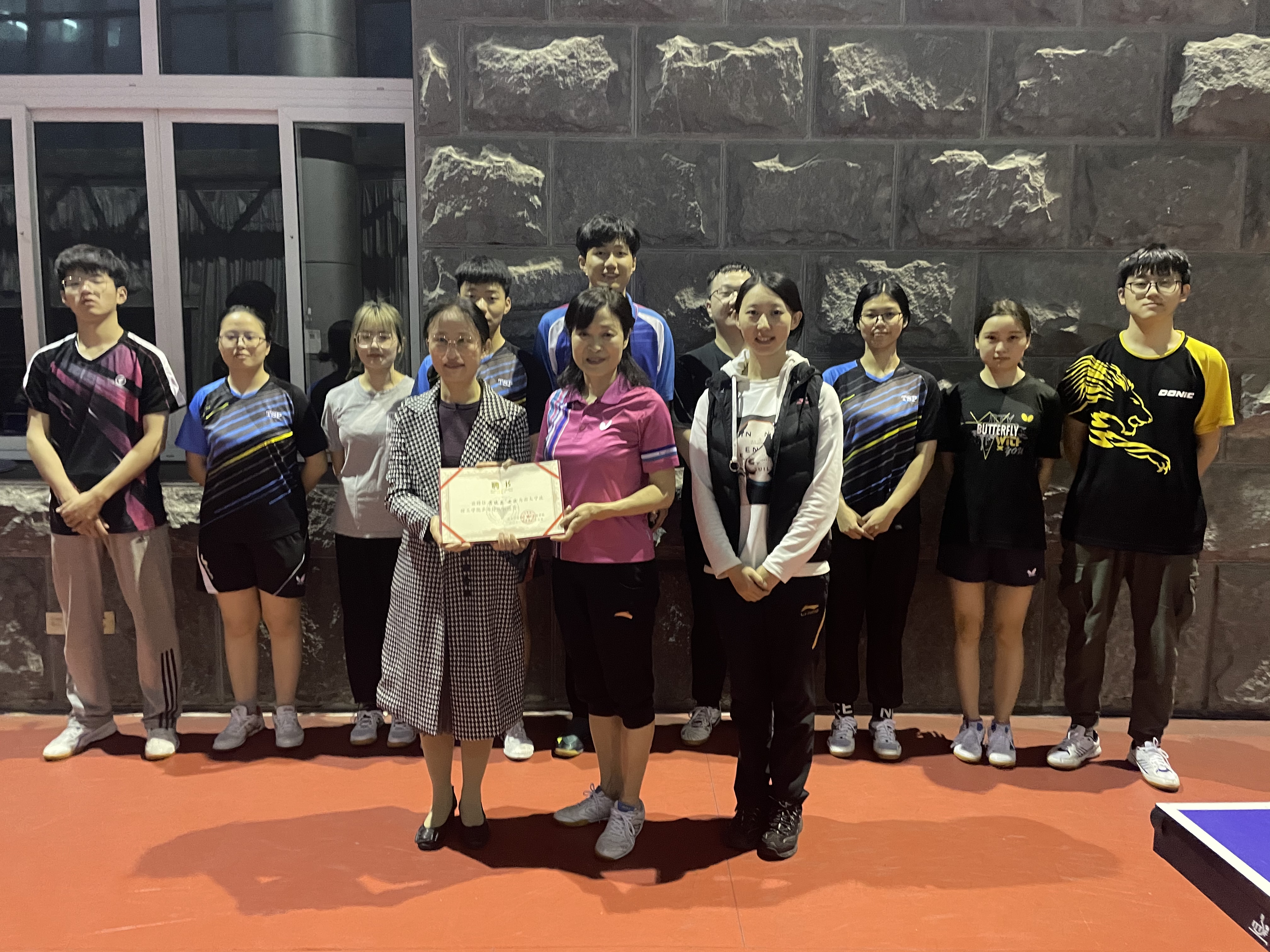 2021年3月30日晚,一场特殊的聘任仪式在学校体育馆举行。启新学院副院长(主持工作)戴革萍为宁波市乒乓球协会副主席兼秘书长、原宁波经贸学院党委书记黄晓英女士颁发聘书,正式聘请黄秘书长为我校乒乓球队教练员。