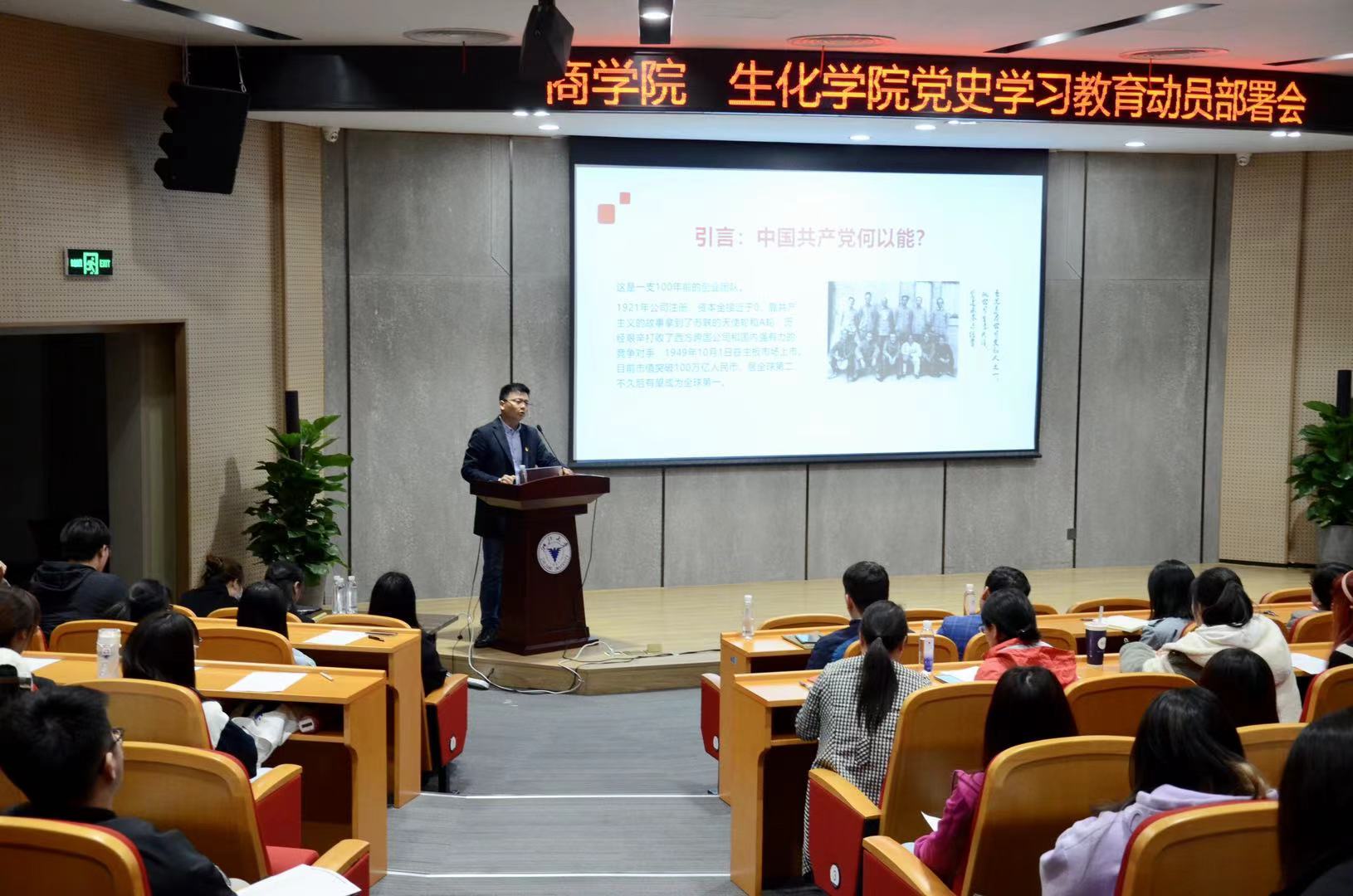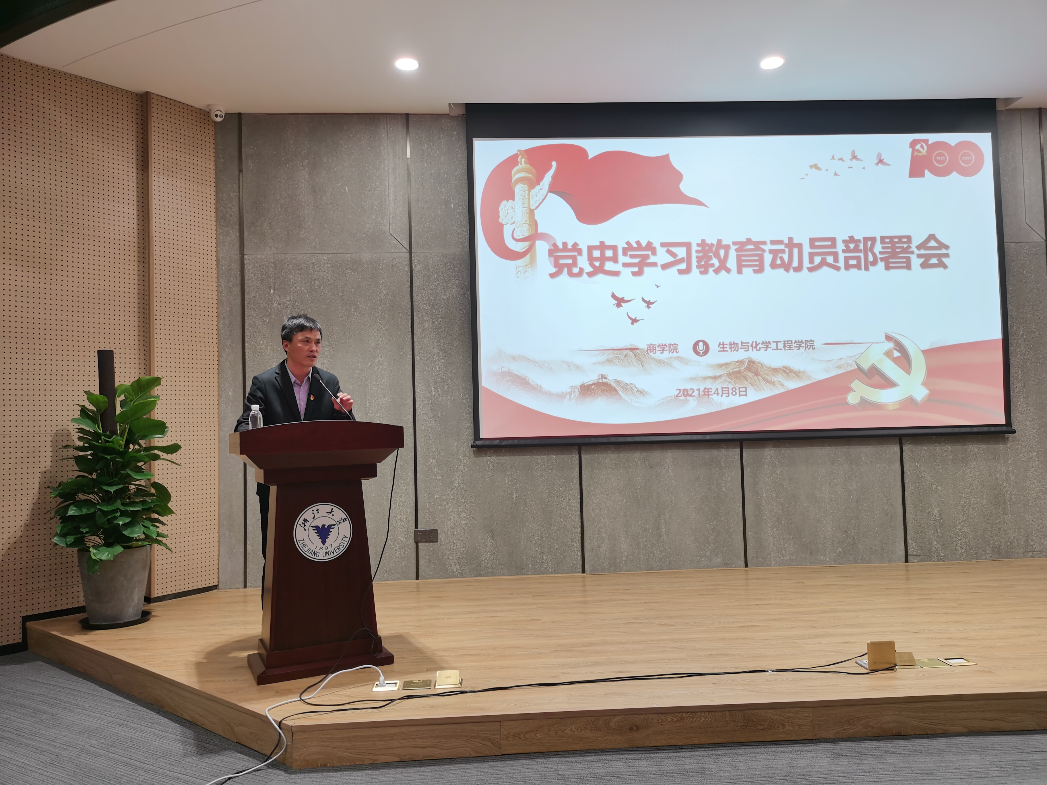 4月8日下午,商学院、生物与化学工程学院在启新大讲堂联合召开党史学习教育动员部署会。商学院党委书记兼副院长李萍萍,党委副书记、纪委书记周丽娟,各党支部委员、第四十期入党积极分子参加动员部署会;生化学院党委副书记(主持工作)兼副院长楼文军,全体学生党员、第14期重点发展对象参加会议。马克思主义学院副教授吴新林受邀做党史学习教育专题党课。楼文军主持动员部署会。
