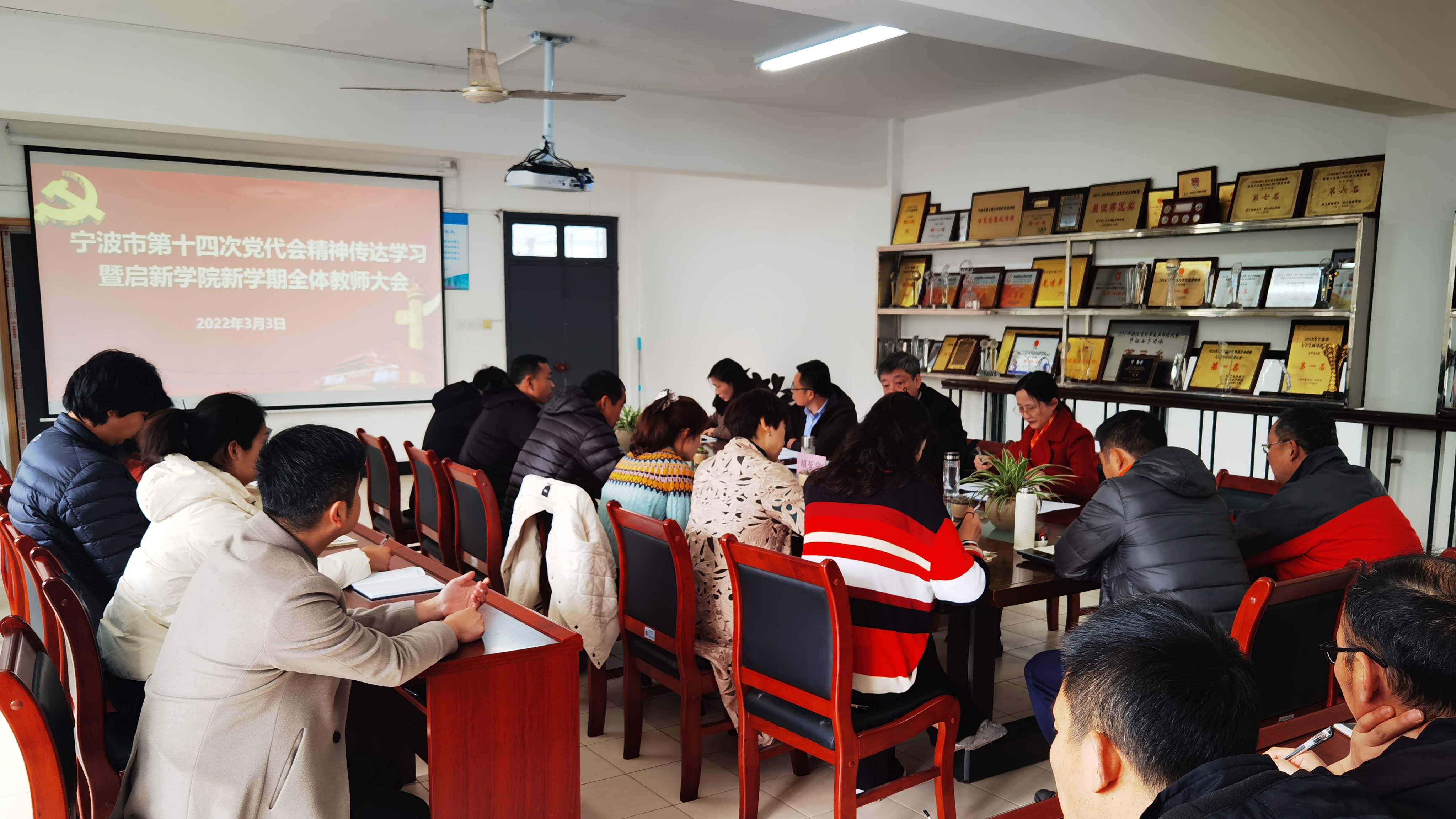 为统一思想、凝心聚力,深入学习宁波市第十四次党代会精神,扎实推进学院2022年度各项工作,3月3日中午,启新学院组织召开了宁波市第十四次党代会精神传达学习暨学院新学期全体教师大会,宁波市党代表、学校党委书记胡征宇应邀出席,会议由学院院长戴革萍主持,
