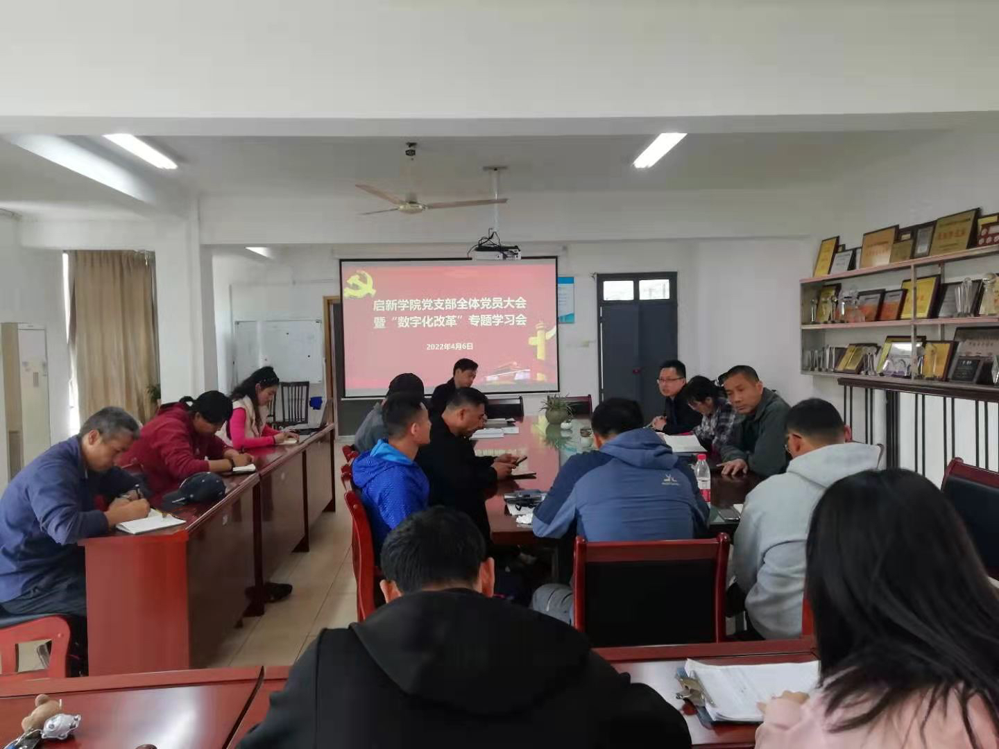2022年4月6日中午,启新学院党支部在游泳馆201-1会议室召开全体党员大会暨“数字化改革”专题学习会。会议由启新学院副院长廖海鹏主持。