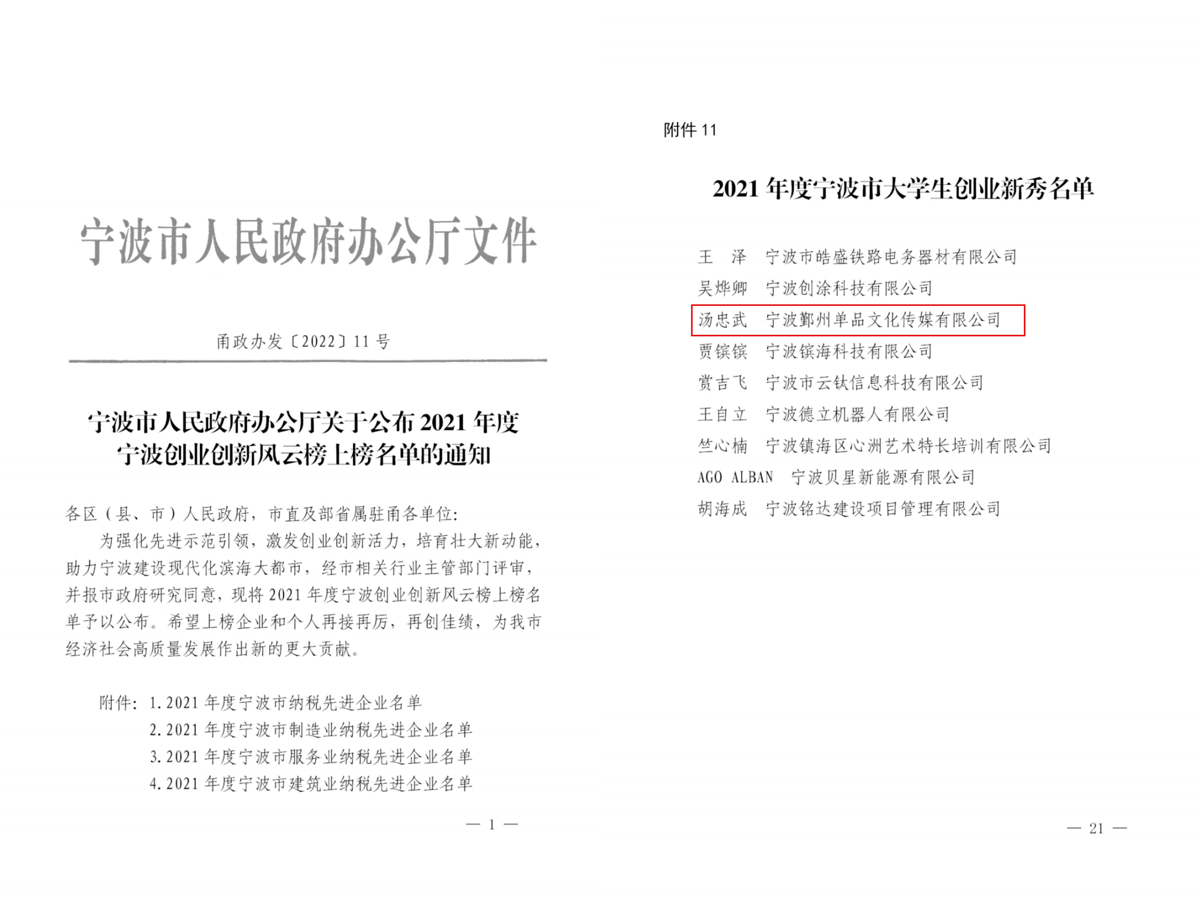 2022年4月20日,宁波市人民政府办公厅发文公布了2021年度宁波创新创业风云榜上榜名单,其中包括9名大学生创业新秀,学校推荐的2016届校友汤忠武名列其中。