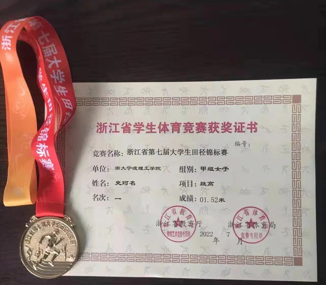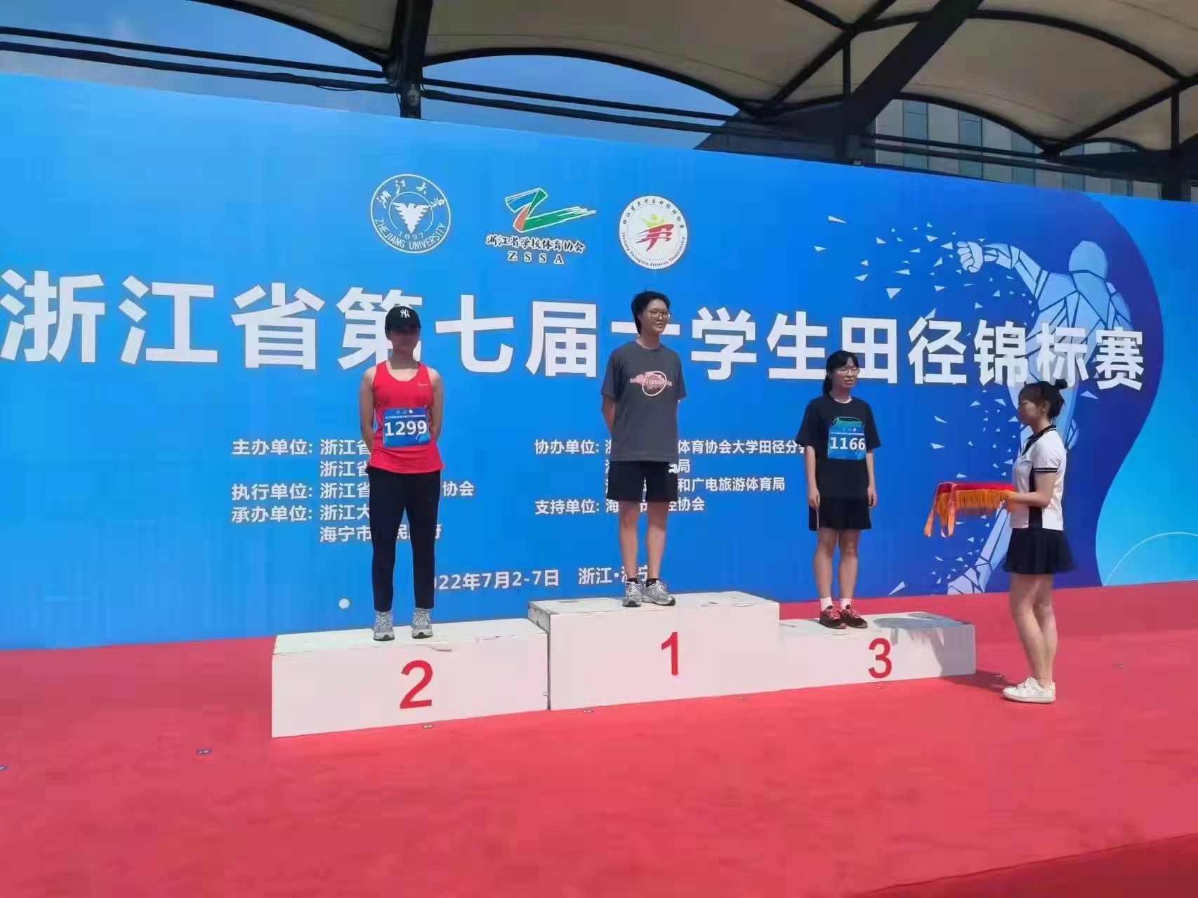 7月6日下午,浙江省第七届大学生田径锦标赛圆满落幕。我校运动健儿顶着高温酷暑,顽强拼搏,取得了优异的成绩:史珂名同学勇夺女子跳高金牌,李洁同学获得女子800米第四名和1500米第六名,王高森同学获得男子铅球第八名,傅鑫源同学获得男子1500米第九名并破校记录,男子团体4*100米项目也破校纪录。