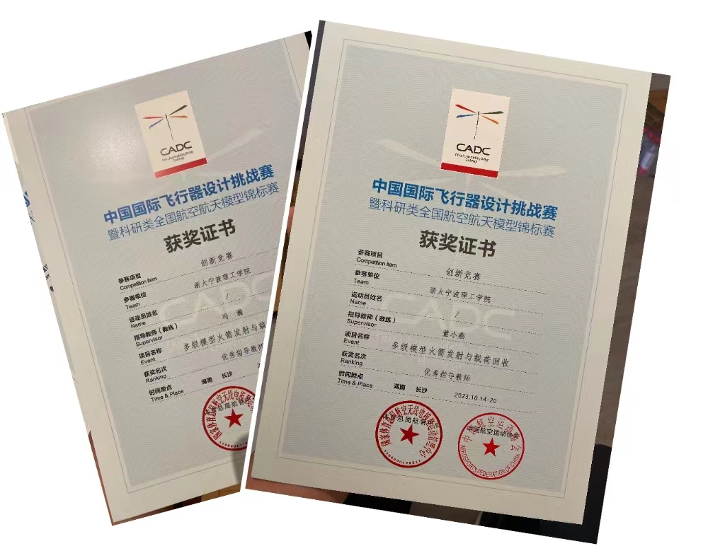 10月14日至20日,我校学子组队参加了在湖南长沙举办的2023中国国际飞行器设计挑战赛总决赛暨科研类全国航空航天模型锦标赛。来自信息学院的6名学生和数据学院的2名学生经过两个月的全力备战,分别参加了《微型折叠飞行器》、《多级模型火箭发射与载荷回收》、《科技创新评比》三个项目,最终在《多级模型火箭发射与载荷回收》项目中荣获国家二等奖,指导教师董小燕和冯瀚被评为优秀指导教师。