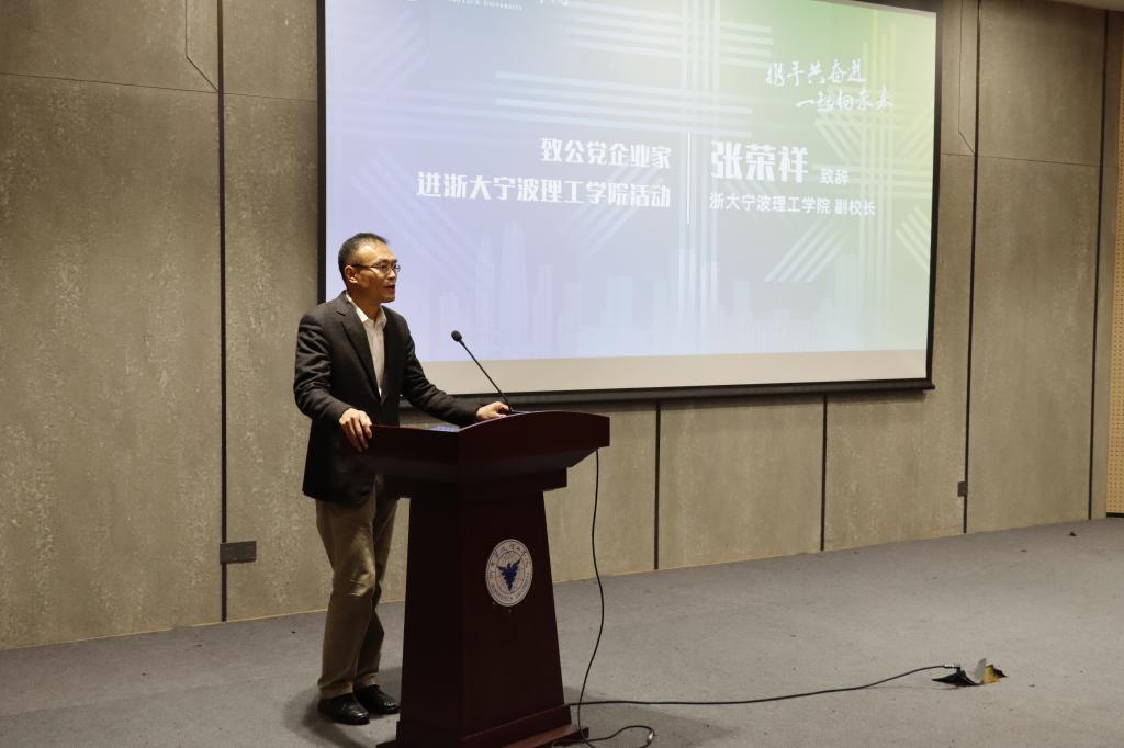 张荣祥向各位来宾介绍了我校的办学理念、办学情况和创新创业工作情况,并指出希望通过今天的活动,持续深化产科教融合,协同促进教育链、人才链、产业链、资金链、创新链有机衔接,致力于学校高素质应用型创新人才培养,聚焦“校政企联动共发展,护航学生创业就业”,共同服务国家发展战略和区域经济社会发展,为宁波奋力争创共同富裕和中国式现代化示范引领的市域样板建设贡献更大力量。