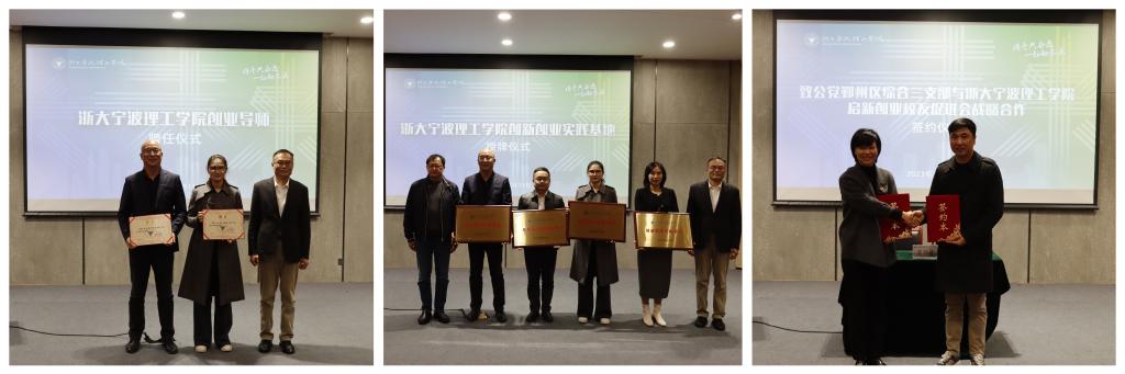 为继续加强创新创业教育,活动现场学校特聘请绿城中国浙江区域集团副总经理、宁波城市公司总经理、宁波市拔尖人才王松岩和斐戈集团股份有限公司副总裁、鄞州区政协委员、宁波市拔尖人才施美为学校创业导师;同时学校与浙江杰博人力资源有限公司、宁波绿城城市公司、斐戈集团股份有限公司、宁波汇海通国际物流枢纽发展有限公司等四家企业共建浙大宁波理工学院创新创业实践基地;致公党鄞州区综合三支部与浙大宁波理工学院启新创业校友促进会也达成了战略合作并进行了签约。从而深度开展全方位、多层次的协同育人合作,持续推进以教促产、以产助教、产教融合、产学合作,进一步提升学生创新创业能力,共同打造市域校企产教联合体。