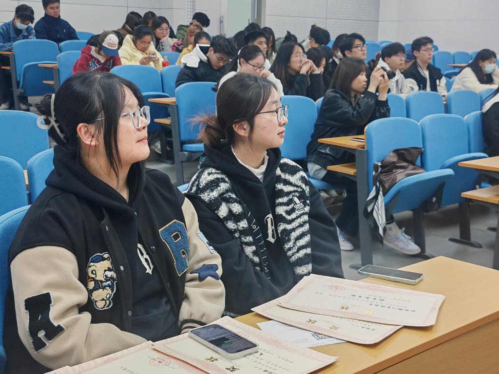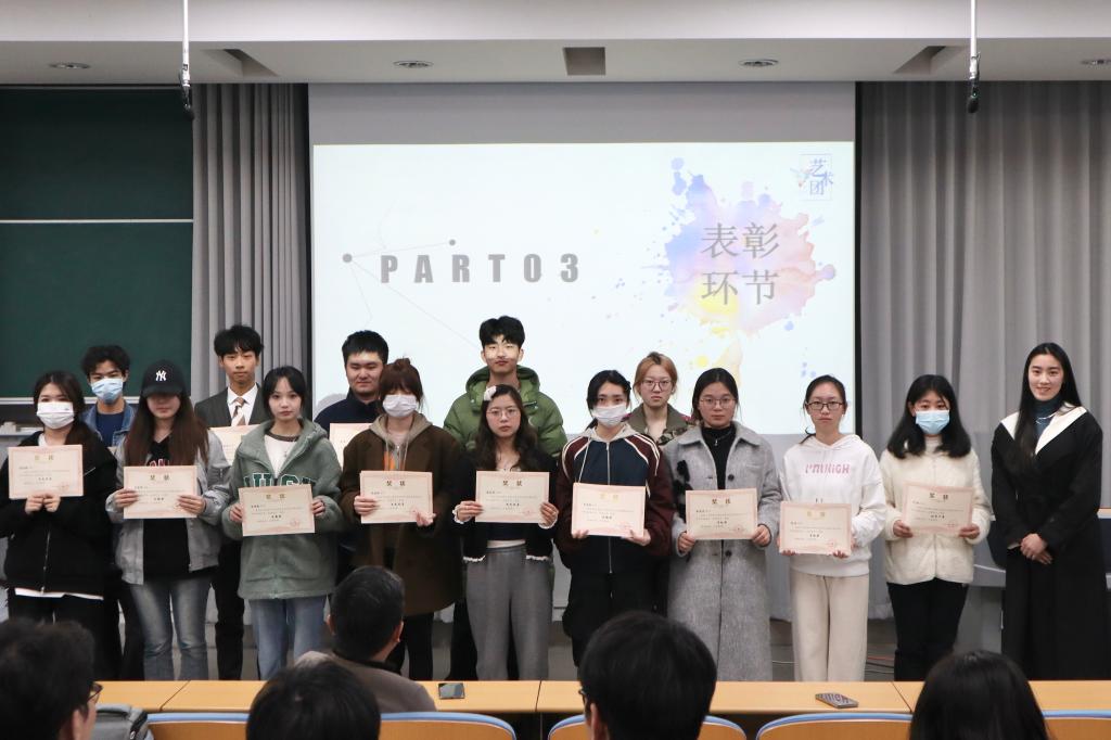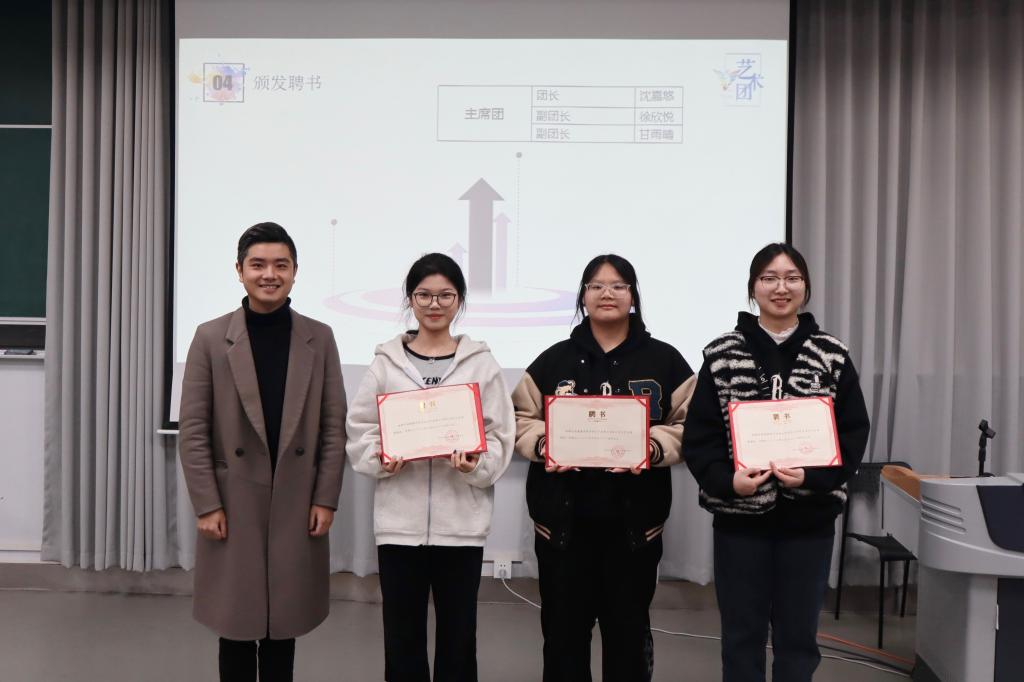 两位老师对在2023年浙江省大学生艺术展演中的获奖分团进行表彰。对在日常训练和工作中有突出贡献的团员进行个人表彰,本次表彰的奖项分为“文艺之星”、“全勤奖”、“贡献奖”和“优秀干事”。同时向大学生艺术团2023—2024年度新任干部颁发聘书。