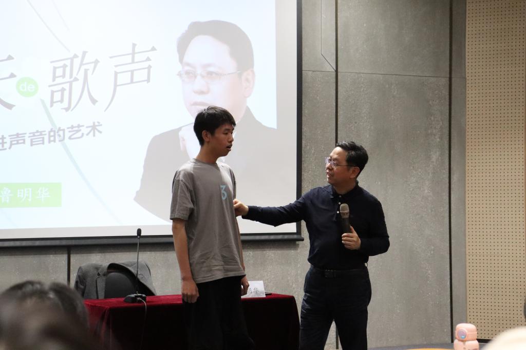 鲁明华从声乐的含义、如何练习声乐、对声乐的思考、声乐的情绪表达等几个方面深入浅出的为同学们普及了声乐知识。并对现场演唱的几位同学进行精彩点评,精准地指出了学生们在演唱过程中存在的不足和亟待解决的问题,并给予他们有效的解决办法,同时还现场示范演唱,加深大家的理解,以帮助学习声乐表演者能够更好地去演唱作品。