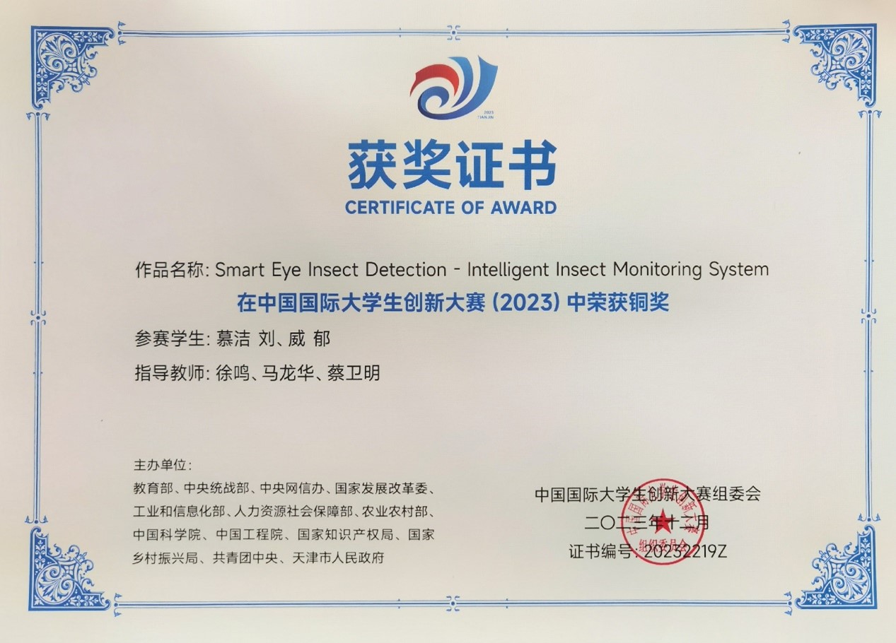 近日,教育部正式公布了中国国际大学生创新大赛(2023)获奖名单,我校信息科学与工程学院徐鸣、马龙华、蔡卫明老师共同指导的创新项目《Smart Eye Insect Detection - Intelligent Insect Monitoring System》荣获铜奖。