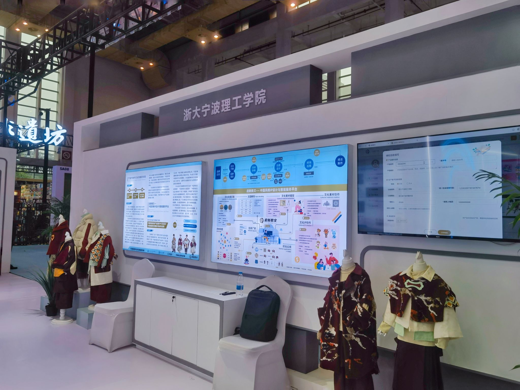 “启新数文——中国风格IP设计与智能服务平台”平台则依托宁波市科技局“揭榜挂帅”项目“中国风格时尚产业品牌 IP 交互设计与智能服务关键技术集成与应用”的支持,致力于通过中国传统文化资源整合、文化基因解码和文化智能设计工具开发,以数字文化赋能时尚行业的转型升级和高质量发展,构建面向时尚行业的“中国传统文化资源库”“中国传统文化基因库”“中国传统文化设计素材库”等3个数据库,并构建了面向时尚行业的文化基因解码规范。同时平台也集成开发了设计素材智能提取、IP设计智能生成、IP设计虚拟展示等智能工具,在展会中,主要展示了文化资源智能搜索、文化基因智能解码、设计元素智能提取、文化IP智能生成、IP服装虚拟展示等功能。