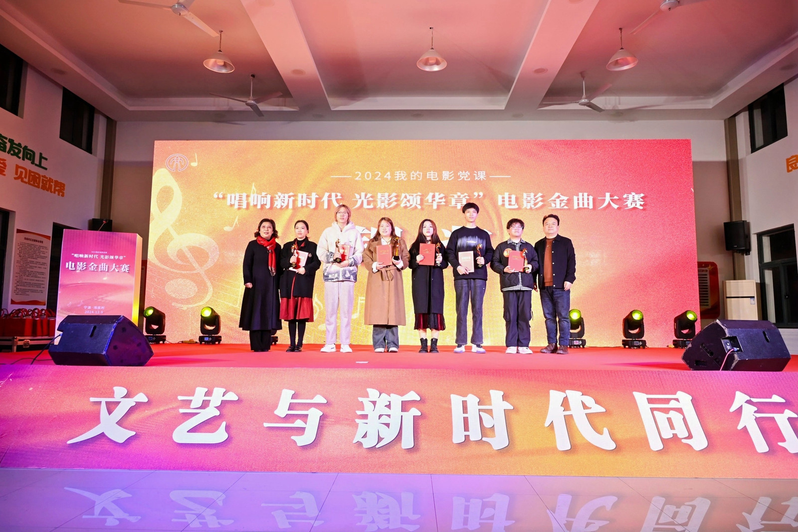 近日,宁波2024我的电影党课—“唱响新时代 光影颂华章”电影金曲大赛在鄞州区下应街道湾底村文化大礼堂圆满落幕。本次活动由我校携手鄞州区文学艺术界联合会等多家单位联合主办,不仅为湾底村的和美乡村建设增添了新动力,也为我校师生提供了一个文艺赋能乡村振兴的宝贵平台。